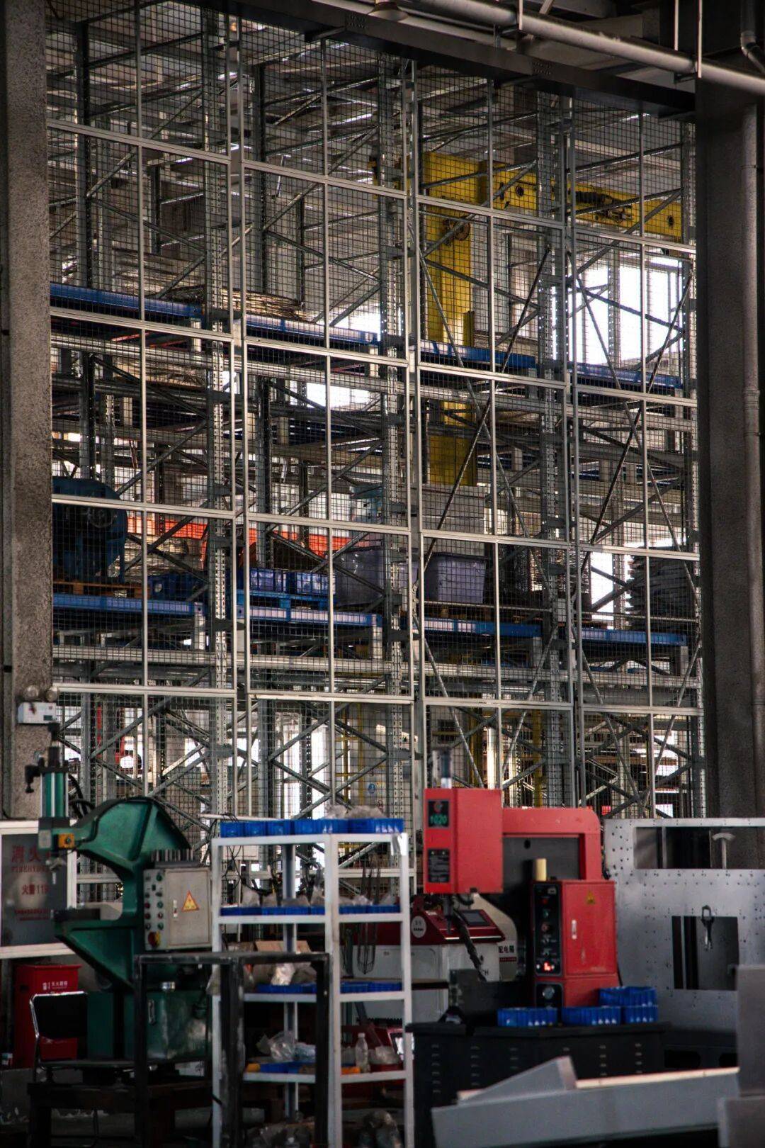 高大的中央干式除尘系统正在进行预组装,未来它将像巨型肺叶一样,通过复杂的管网连接整个车间的空气循环;